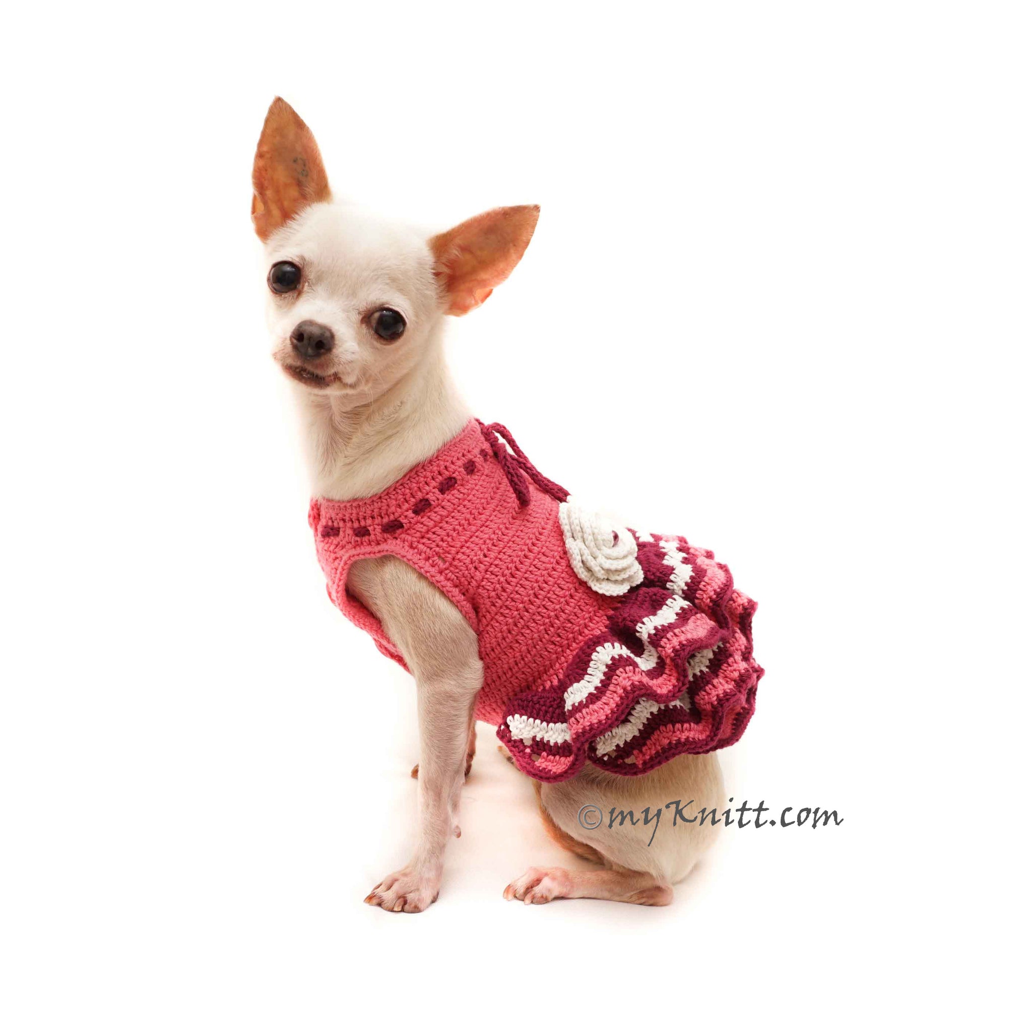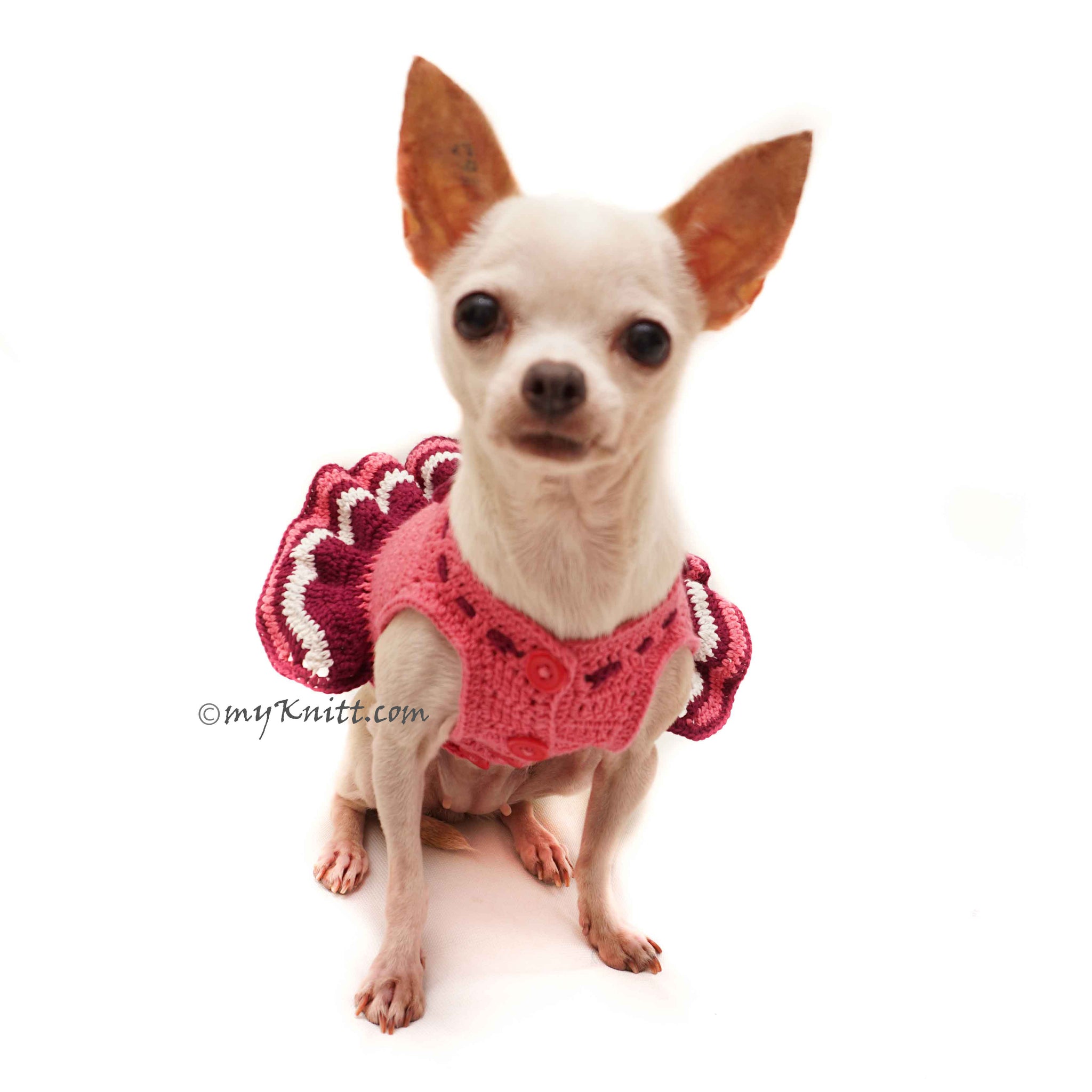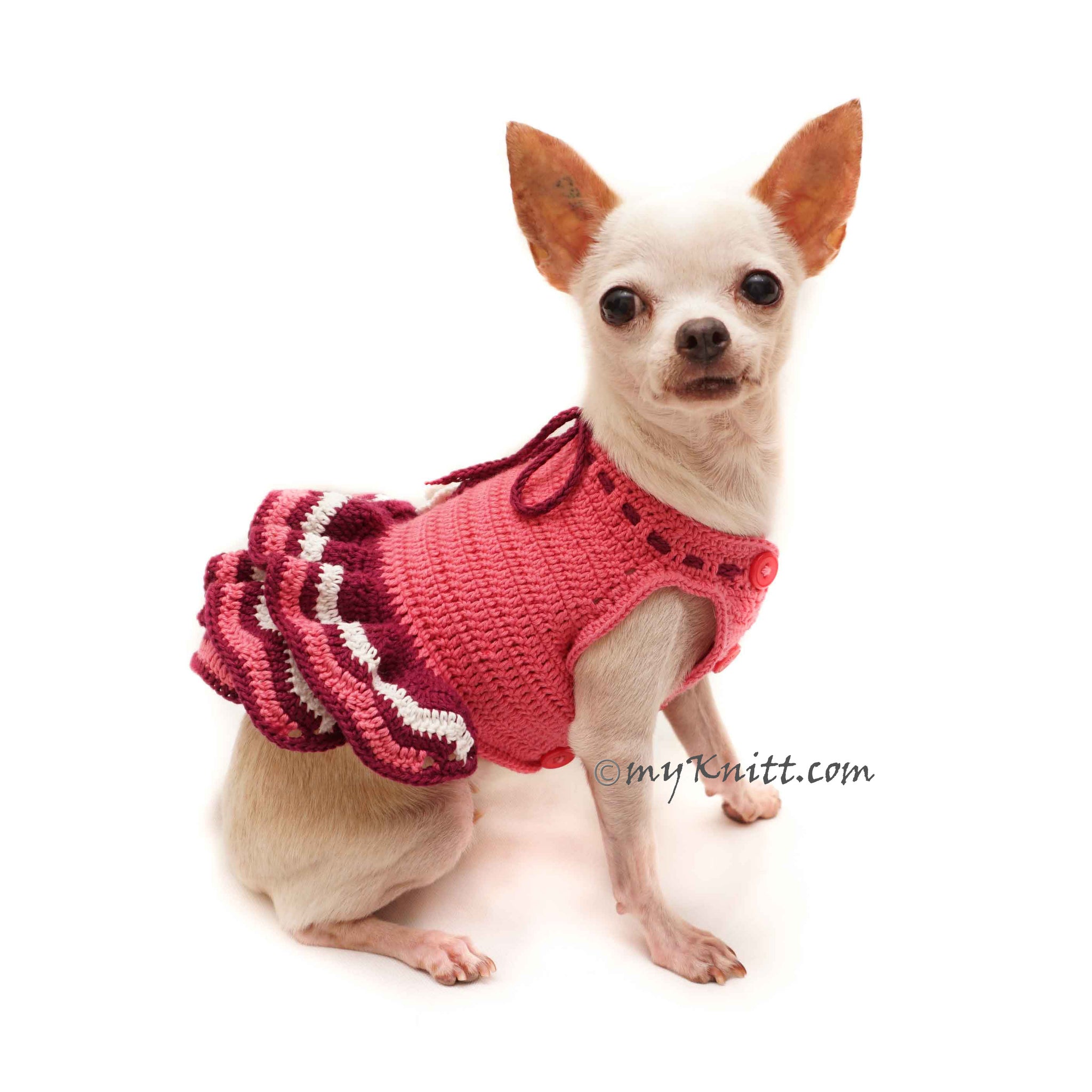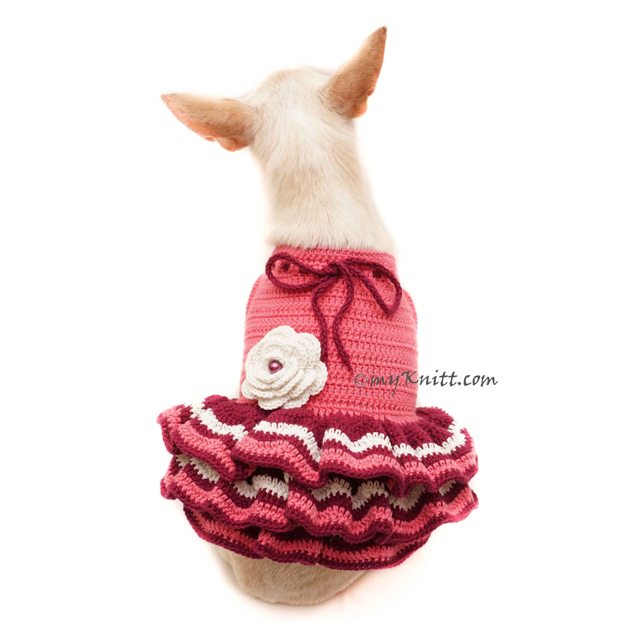 Cute Dog Dress Ruffle Crochet in Pink and Burgundy Stripped Color. Designed and handmade crochet dog clothes by Myknitt. Made of 100% cotton yarn material.