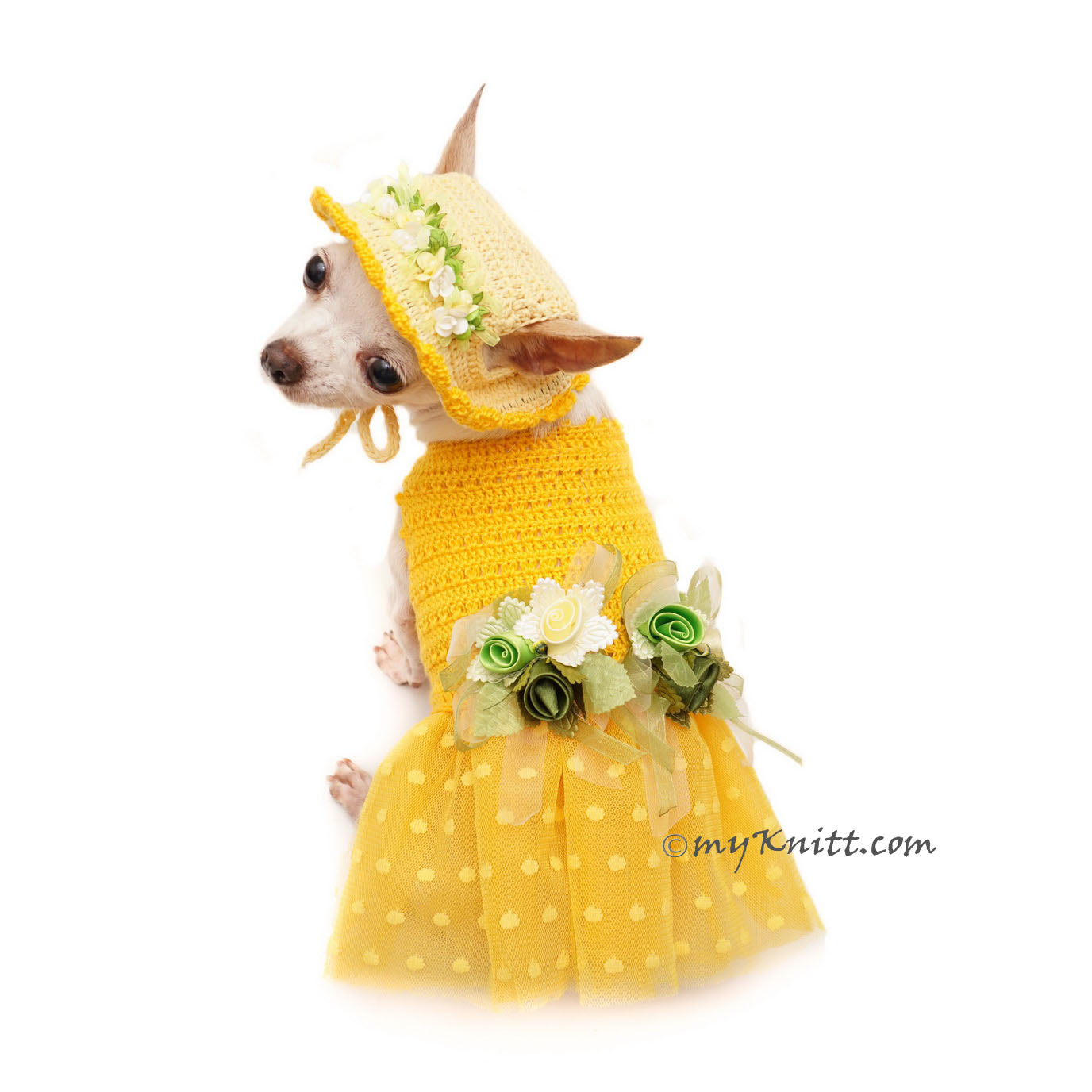 Polka Dot Yellow Dog Dress Tutu with Matching Sun Hat. New and unique collection from Myknitt Designer Dog Clothes. Perfects for party, photo shoot, or fashion show.