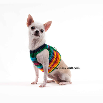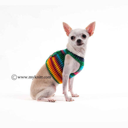 Choke free comfortable puppy harness with cute Rainbow motif design from Myknitt Designer Dog Clothes. Adjustable Velcro attached at the back of the harness. Made of 100% cotton yarn material, not stretch. Any custom dog harness are welcome.