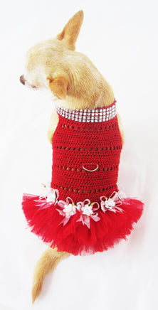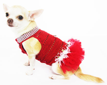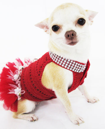 Red Dog Dress Tutu Neck Bling Metal Accessories DF22 by Myknitt Designer Dog Clothes. Handmade Crochet using 100% cotton yarn material. Custom made to fit your furbaby's body measurements.
