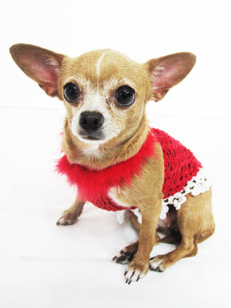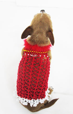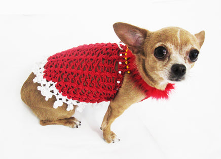 Red Christmas Dog Dress with Gold Pearls and Fur by Myknitt Designer Dog Clothes. Handmade crochet made of 100% cotton yarn material.