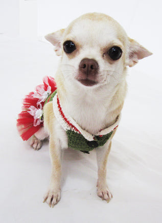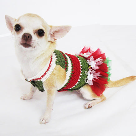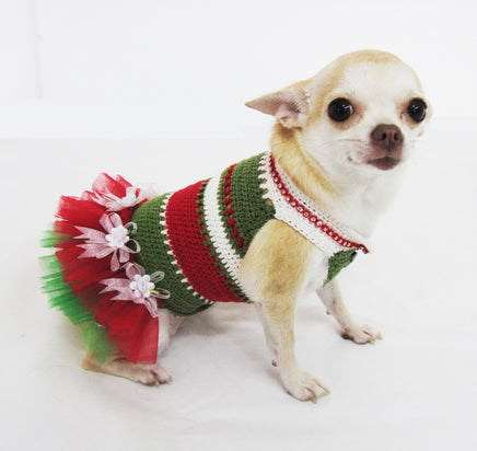 Christmas Dog Dress Tutu Red Green Myknitt Designer Dog Clothes. Handmade crochet dog dress made of 100% cotton yarn material.